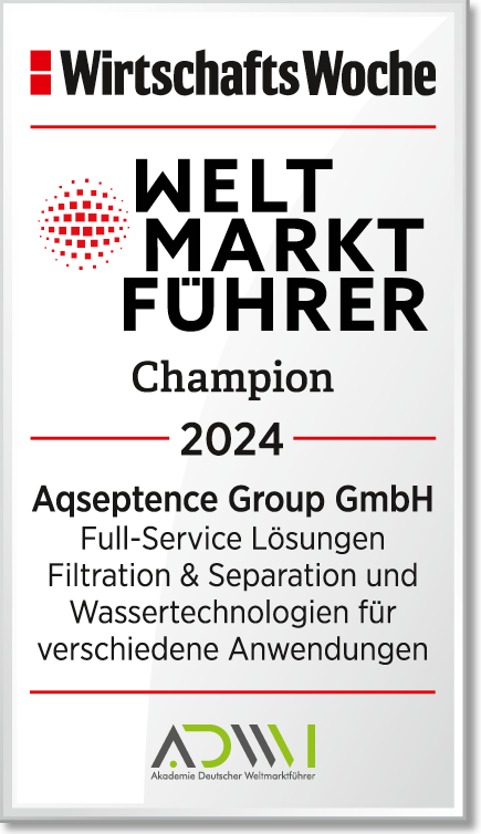 Aarbergen, 06.11.2023 - Aqseptence Group is pleased to announce that the company has been awarded the coveted "Global Market Leader" seal by the leading business magazine WirtschaftsWoche for its full-service solutions in the field of filtration, separation and water technologies for various applications.